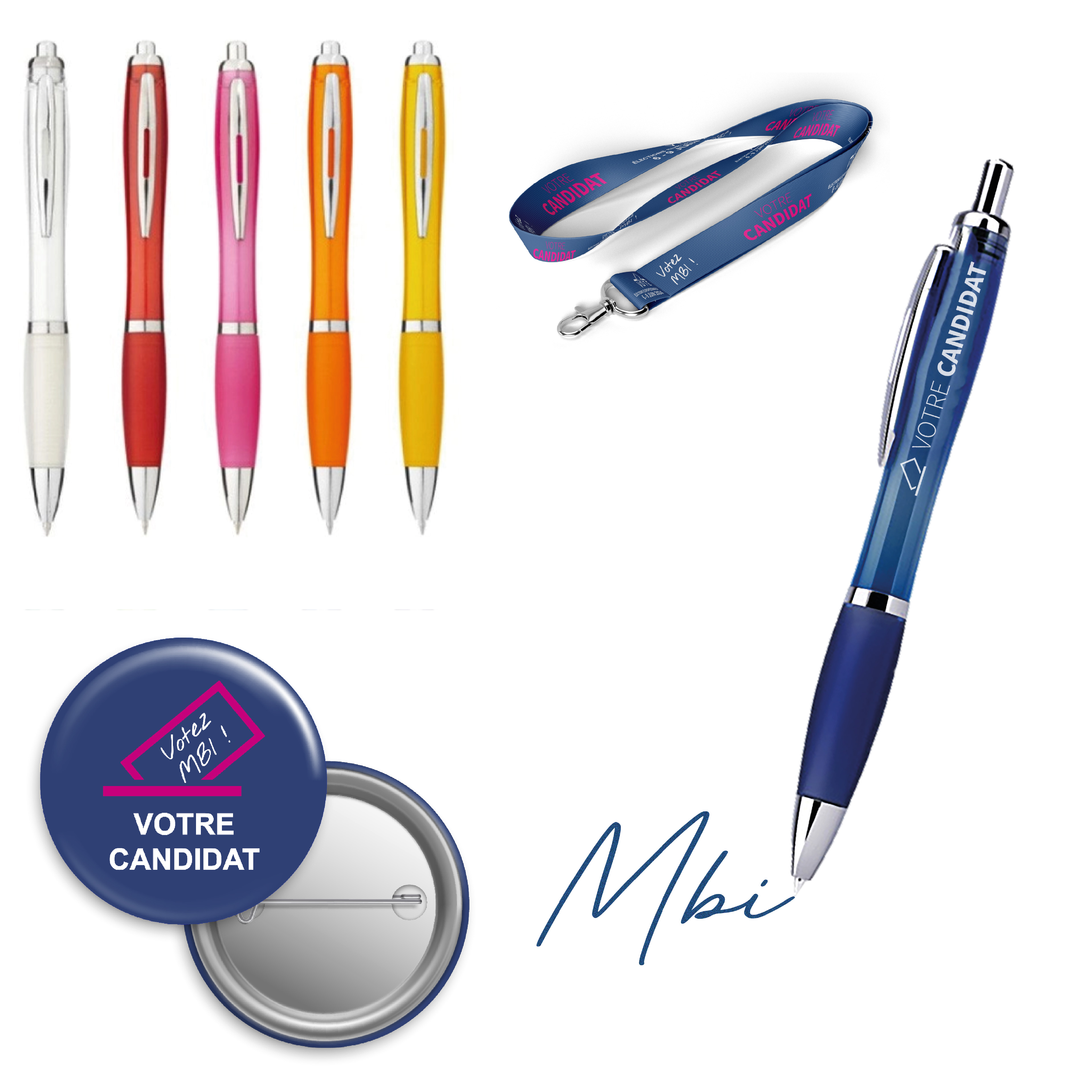 Les stylos, badges et tour de cou personnalisés sont des outils efficaces pour renforcer l'image de votre campagne.